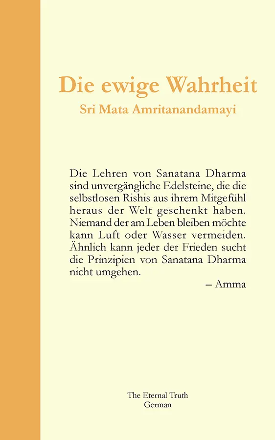 Die Lehren von Sanatana Dharma sind unvergängliche Edelsteine, die die selbstlosen Rishis aus ihrem Mitgefühl heraus der Welt geschenkt haben. Niemand der am Leben bleiben möchte kann Luft oder Wasser vermeiden. Ähnlich kann jeder der Frieden sucht die Prinzipien von Sanatana Dharma nicht umgehen - AMMA
