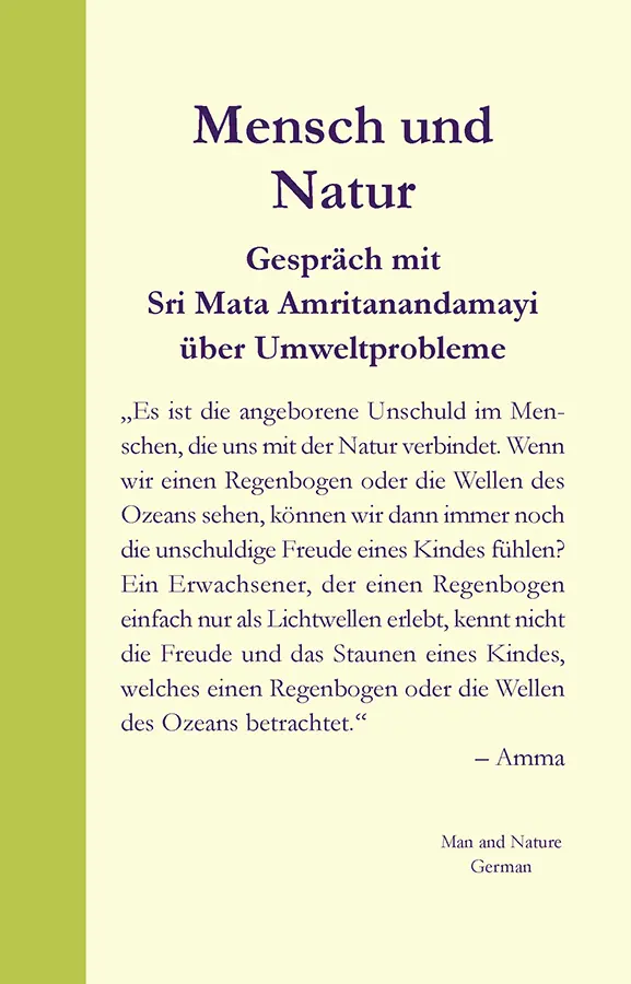 Dieses kleine Buch enthält Ammas Antworten auf drängende Fragen der Umweltpolitik, die ihr von dem bekannten amerikanischen Umweltschützer Sam LaBudde vom Earth Island Institute in San Francisco gestellt wurden. Paperback, 84 Seiten