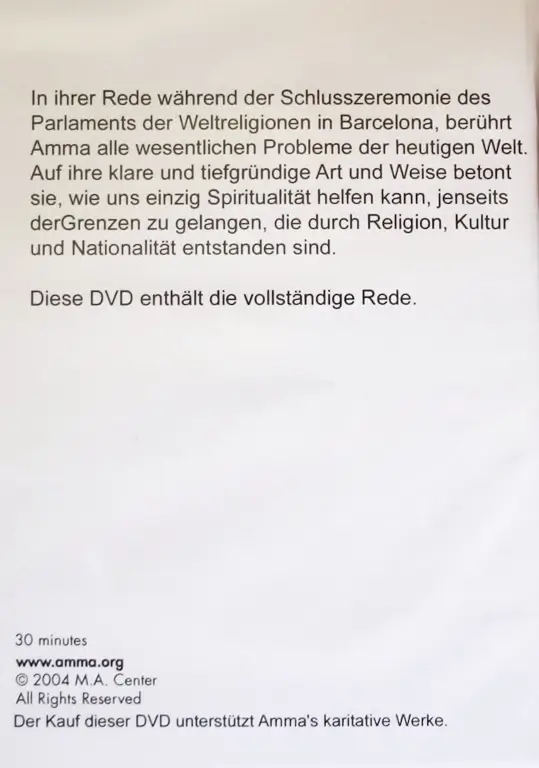 Barcelona Rede 2004 beim Parlament der Weltreligionen. In dieser Rede berührt Amma alle wesentlichen Probleme der heutigen Welt und betont, wie einzig Spiritualität helfen kann, jenseits der Grenzen zu gelangen, die durch Religion, Kultur und Nationalität entstanden sind.